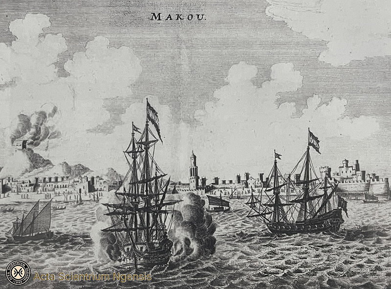 荷蘭人在1665年再次襲擊澳門規模遠不及前數次的戰鬥。原本題為Vista de Macau (Makou) in L'Ambassade de la