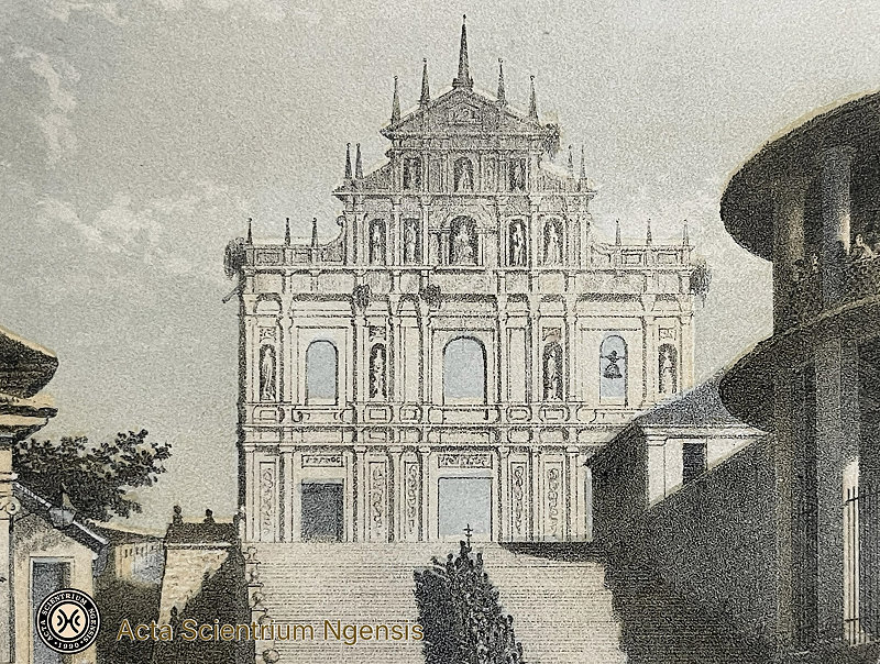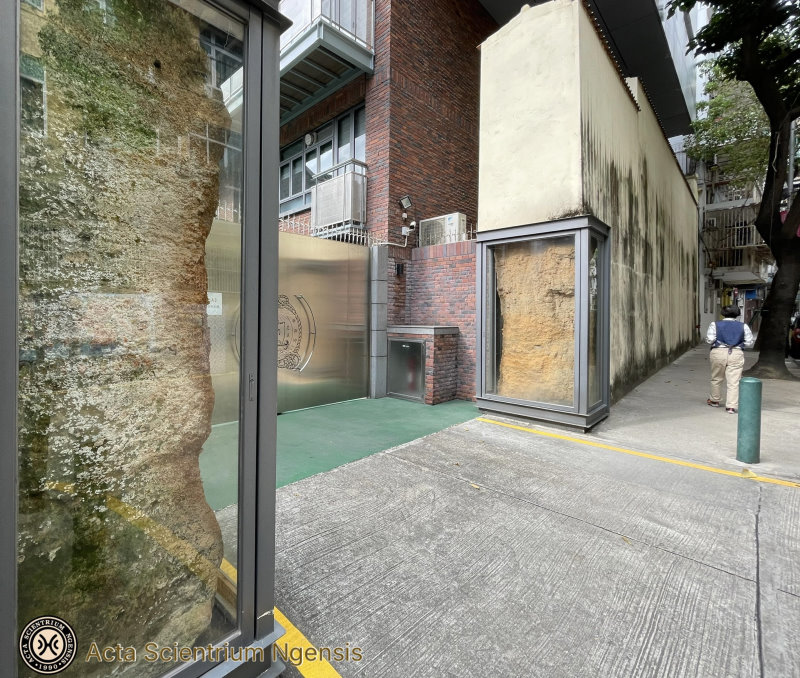 大三巴在焚毁之前的銅版畫作品,顯示出這座名為「天主之母教堂」,為當時重要的宗教場所,十九世紀中葉大三巴修院手工上色銅板畫 Jesuit Convent Macao 1852-1854. 圖片來源: 延陵科學綜合室藏 澳門聖保祿學院圍牆建於1606年,屬於中世紀封閉庭園 (Hortus conclusus) 的設計理念,將學院各設施如教堂、教學區、庭院、宿舍等包圍在內。分析圍牆結構的材料與建築工藝,如夯土與石塊結合的牆體結構,牆體層次清晰,見包灰青磚層和黃土夾層,牆體結構穩固,保存至今的牆段在高園街等地已有考古發掘標誌學院的邊界,反歷史建築格局和學院歷經多次火災和重建,圍牆見證了其興衰變遷,是研究聖保祿學院歷史和東西文化交流的重要實物遺存。