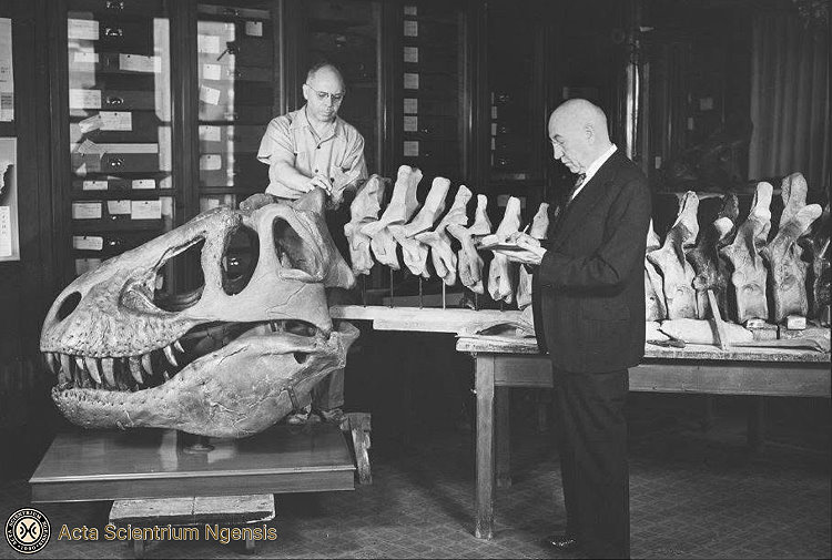 1942 年查爾斯朗 (Charles Lang) 和巴納姆布朗 (Barnum Brown) 在實驗室研究暴龍骨架