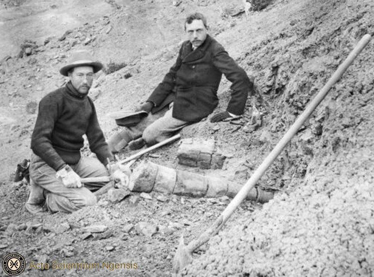 1897年,巴納姆·布朗和亨利·費爾菲爾德·奧斯本坐在懷俄明州科莫布拉夫一塊部分挖掘出的梁龍骨骼旁。美國自然史博物館圖書館館藏編號:17808。圖片來源: