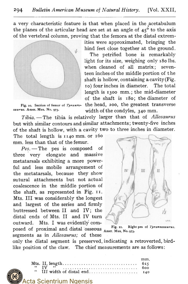 馬修博士的初步描述,將這些骨骼放在一起後,與人類骨骼相比,這種動物的巨大比例就顯而易見了。總長度估計為39英尺,頭骨離地高度為19英尺。除了上表中列出的部分外,我們還準備了額骨的眶上部分,這部分極為粗糙,在眼眶上方形成一個角狀突起,與異特龍的非常相似。