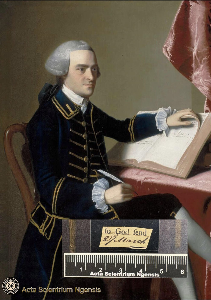 約翰•漢考克 (1737-1793) (John Hancock) 〔WP?? march〕(剪片)。 圖片來源: 延陵科學綜合室藏 第一屆大陸議會議長(1775-1777)約翰•漢考克(1737-1793) (John Hancock) 獨立宣言首位簽署人 約翰•漢考克 (John Hancock,1737年–1793年) 是美國著名的商人、革命家與政治家,也是美國獨立的重要人物之一,漢考克出生於麻薩諸塞州的一個富裕家庭,後承繼叔叔的商業帝國,成為北美十三州最富有的人之一,他積極參與反英運動,是波士頓革命領袖,並因其財富資助了美國獨立運動。1775年至1777年,擔任美國大陸會議主席;1780年至1785年以及1787年至1793年,兩度出任麻薩諸塞州州長。他以在《美國獨立宣言》上華麗且醒目的簽名著稱,美國用「John Hancock」代指親筆簽名。晚年運用影響力,促使麻薩諸塞州批准《美國憲法》,確保新生美國的穩定。