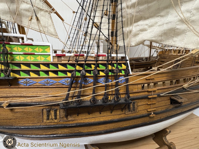 (約7.6米) ,載重約180噸。船上配有主桅、前桅和後桅,後桅採用晚廓帆 (Lateen
