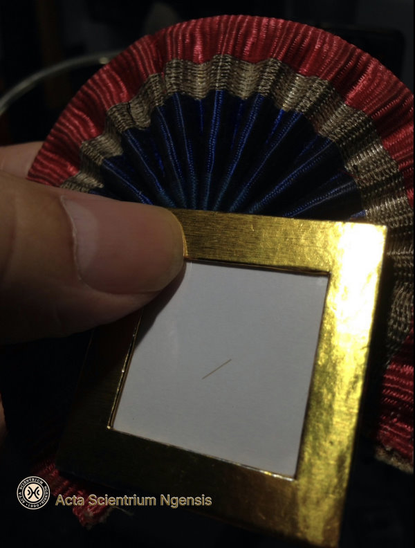 (白方格內中心,髮絲全長0.5厘米, 平均直徑0.04厘米, 原藏品的一少部分,