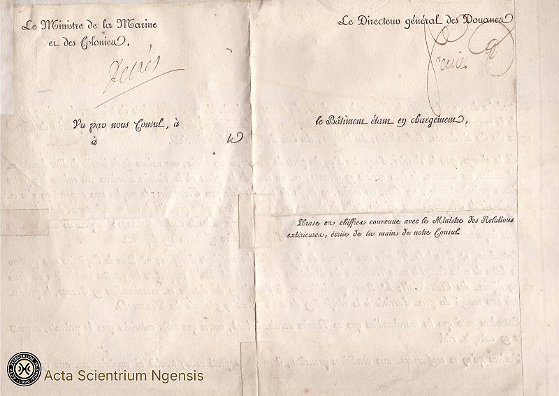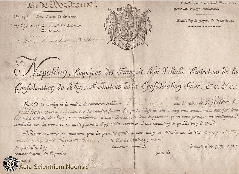 無論是在航行過程中,來自我們的戰艦或法國私掠船以及我們盟友的代表;或在抵達我們港口時,來自我們海關官員的代表;但若有違反規定,或任何欺詐行為,該許可證將被宣布無效等等….。法國皇帝拿破崙御筆簽署生效。圖片來源: