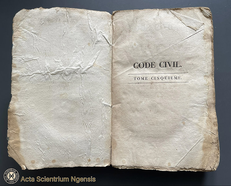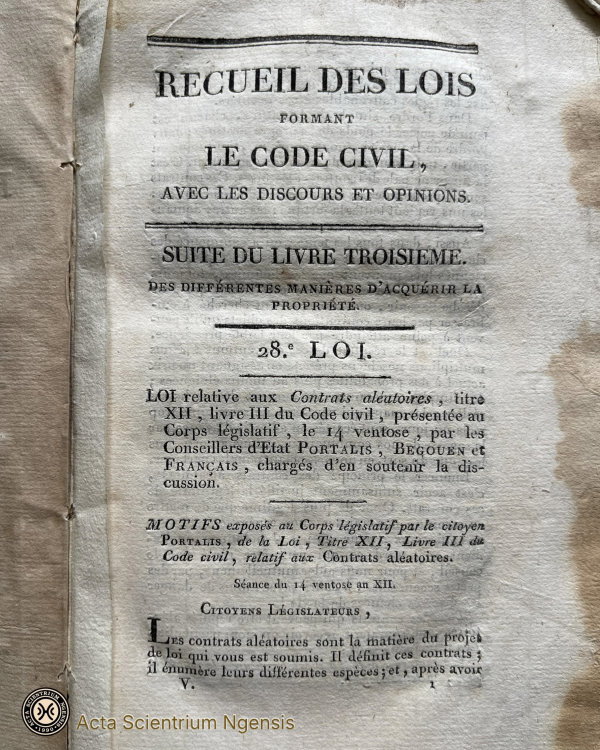 LOIS」,「民法典,法律彙編」。這本書收錄了構成民法的法律條文,還包括演講、報告和意見,以及經過分類的主題目錄。「CODE CIVIL, OU RECUEIL