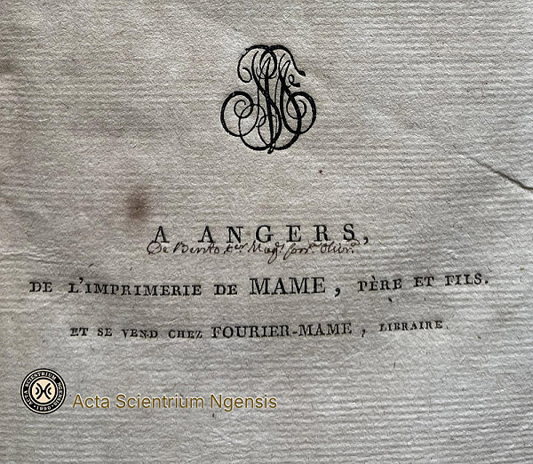 SE VEND CHEZ FOURIER-MAME, LIBRAIRE」在Fourier-Mame書店出售。封面中央有一段手寫字,寫在「A