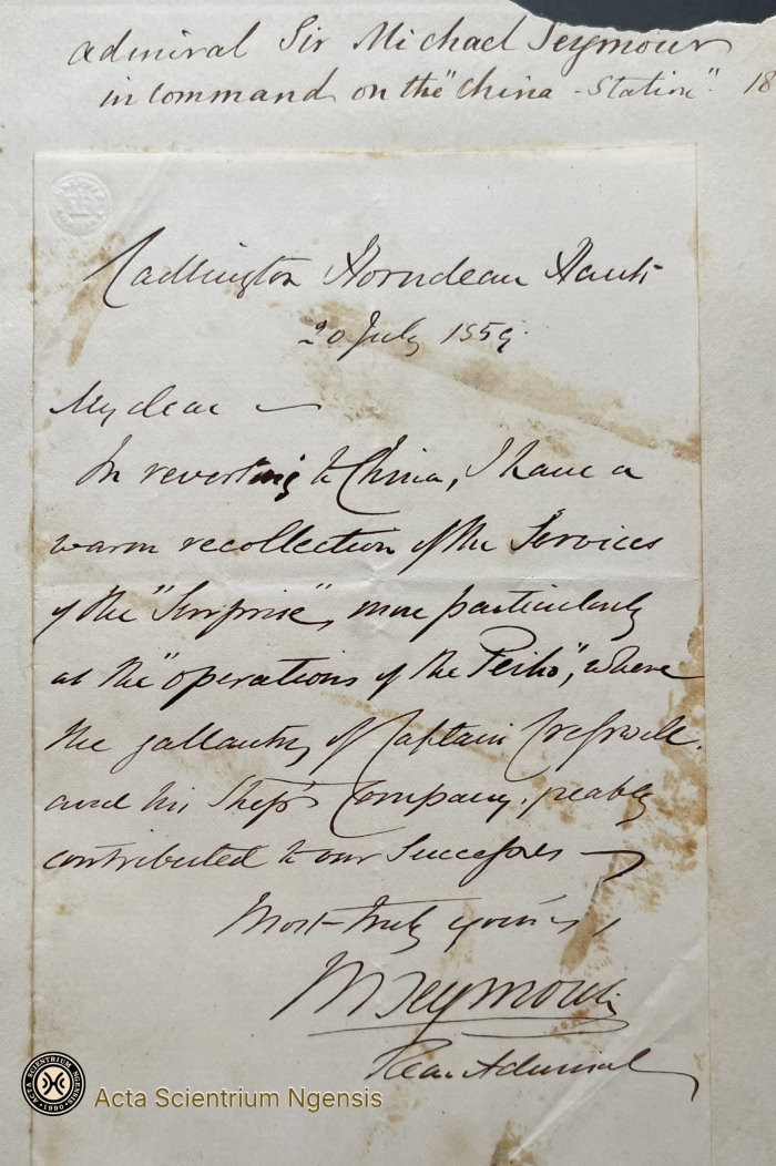 詹姆士·霍普·格蘭特爵士的信函剪片。(圖片來源: 延陵科學綜合室檔案室)