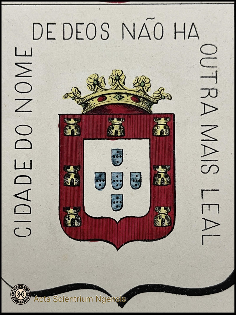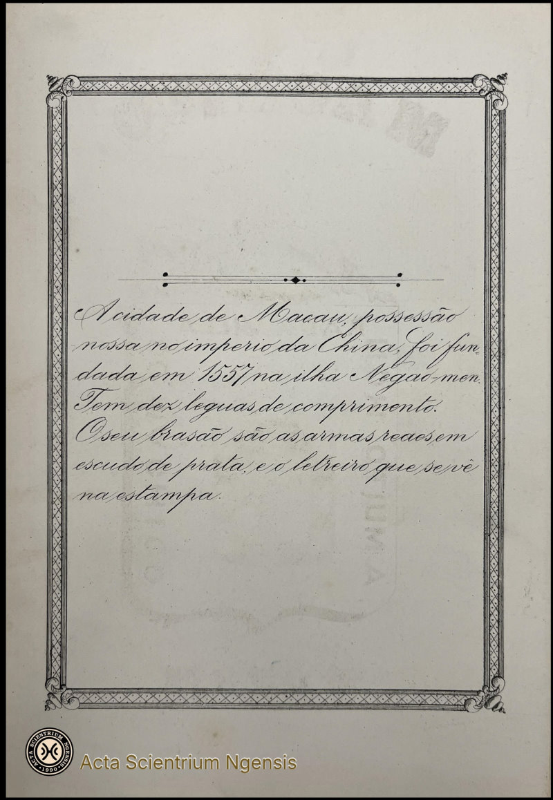 澳門城 (Cidade do Nome de Deus de Macau) ∼1557葡萄牙帝國在中國帝國內的領地,其城市紋章徽號為葡國王室的銀盾徽章。圖片來源: 延陵科學綜合室藏