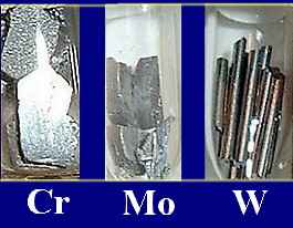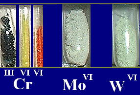 外層電子構型為 nd5(n+1)s1, n=3(鉻); n=4(鉬), 鎢: 5d46s2, 氧化態 +3 ~ +6, 以+6 為主。