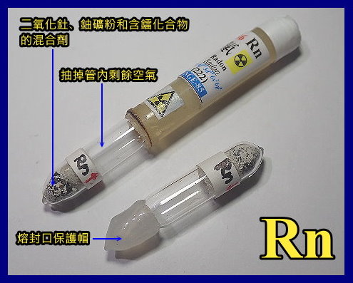附註: 這是一個臆測性標本, 事實上未有可靠方法證明氡的存在和與其他元素的相異性質。 為獲得比較接近天然存在氡元素的幾個最穩定同位素的混合體, 標本管以高純度二氧化釷(TiO2)、瀝青鈾礦 (uraninite) 粉未和含鐳 (Ra) 的磷光粉的混合劑為發生源, 根據釷不斷嬗變產生釷射氣 [(Thoron Tn, = 氡-220( 86Rn220 )], 鈾系嬗變中的鐳產生鐳射氣 [氡-222, (86Rn222 )]。 雖然氡有放射性, 本身會衰變成其他元素, 而且半衰期祇有 55秒, 最穩定的 86Rn222 半衰期也祇是 3.83天, 由於有足量的二氧化釷 、鈾和鈾補充, 故此氡的含量總量達到“穩定狀態”, 因為釷衰變產生的新氡原子不斷地取代已衰變原子。基於發生源中的幾個放射性核素的半衰期非常的長, 在我們有生之年的歲月, 標本管內氣體的劑量將永遠保持一定濃度的。 |