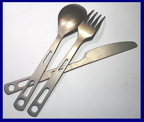 編者私人使用的純鈦製餐具: 硬度大但祇有鋁製品的重量。