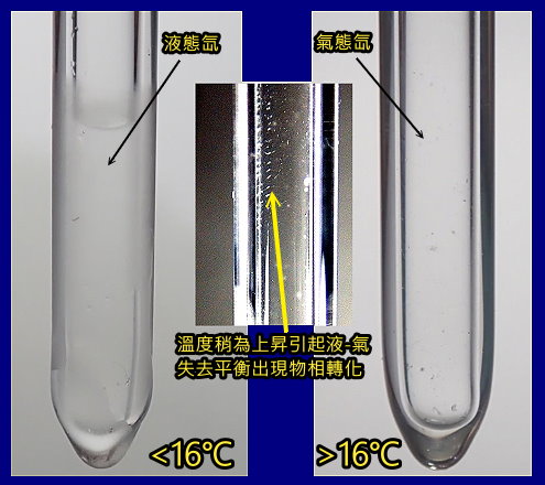 少量高純氣體氙被封在50-100大氣壓的石英管中出現很有趣的超臨界流體(Supercritical fluid, SCF)現象: 在達到臨界壓力和溫度低於攝氏16度時, 氙呈透明流動性強的液體, 此時液態氙和氣態氙的性質類似, 也就是說: 圖中的液體同時具有氣體的性質, 當溫度稍為上昇引起液-氣失去平衡, 此時液相迅速消失而變成氣相氙樣本。