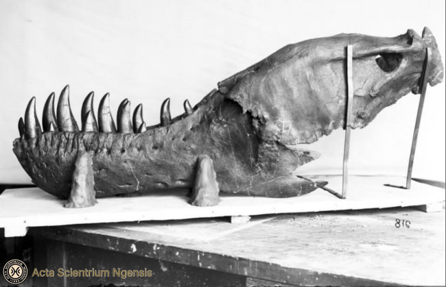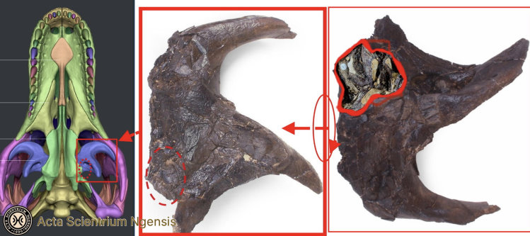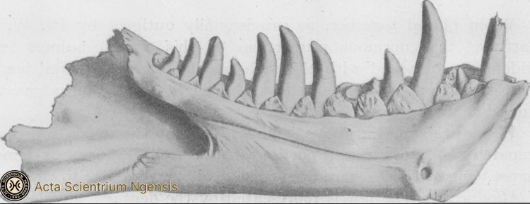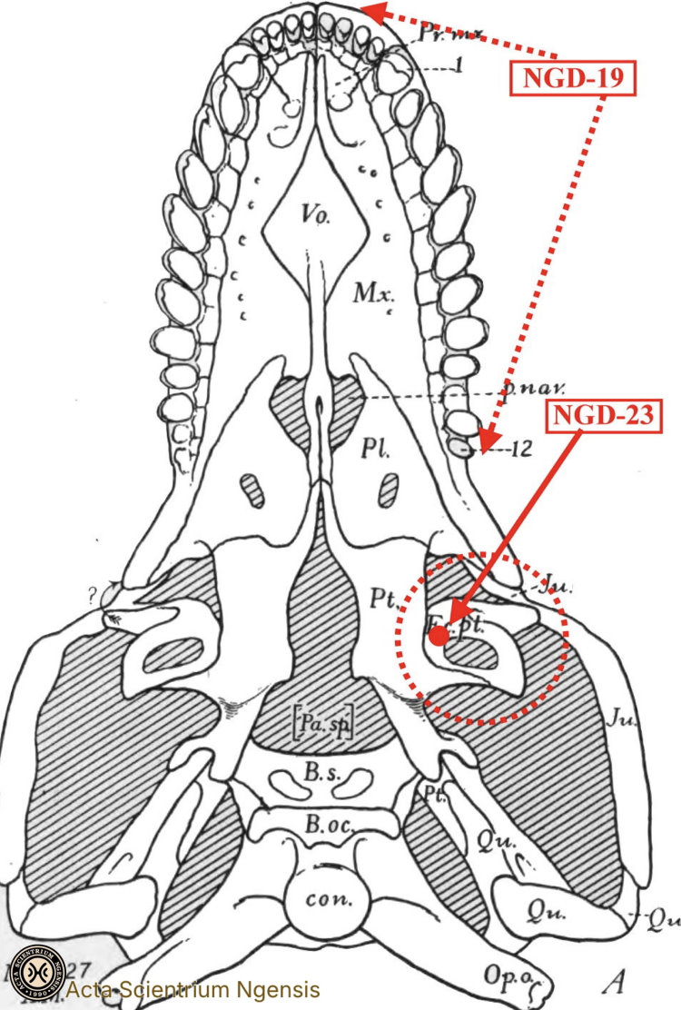 頜骨-牙齒之間有一系列三角形骨板,這些骨板似乎是齒槽壁向上延伸的部分,齒槽壁底部與齒骨邊緣分離。