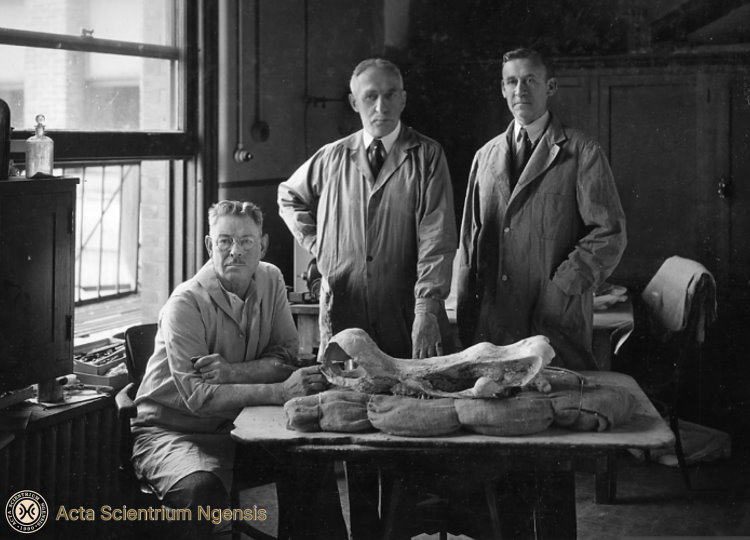 1897年,巴納姆·布朗和亨利·費爾菲爾德·奧斯本坐在懷俄明州科莫布拉夫一塊部分挖掘出的梁龍骨骼旁。美國自然史博物館圖書館館藏編號:17808。圖片來源: