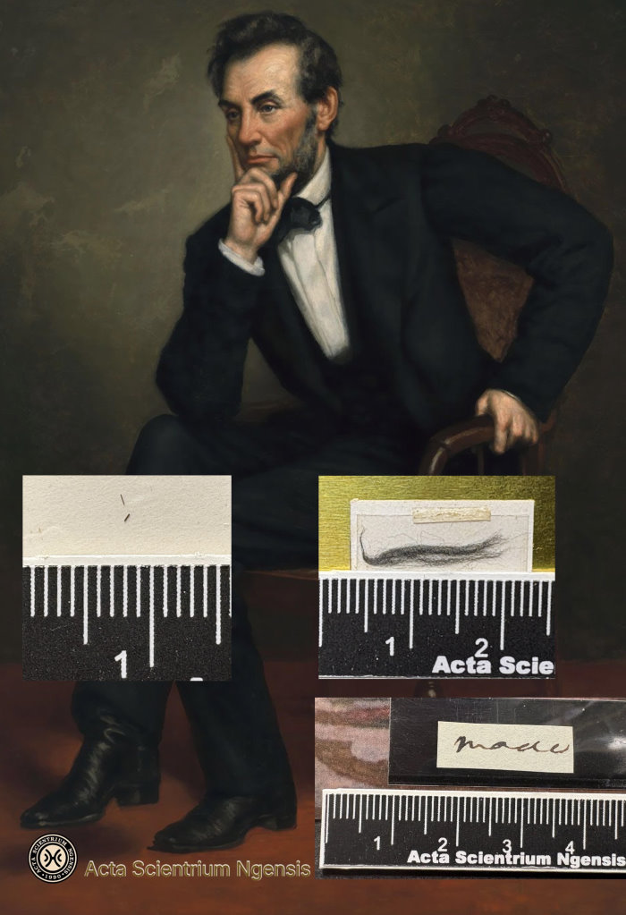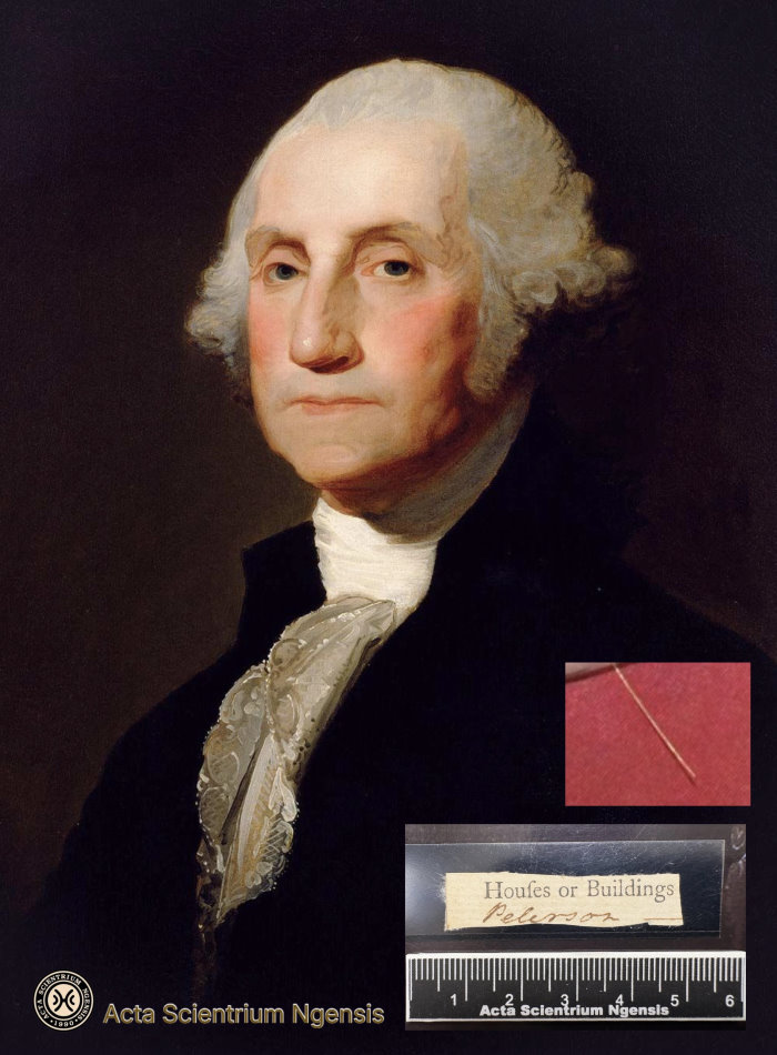 喬治·華盛頓 (1732–1799) (George Washington)手書字跡 〔peterson〕(剪片) 頭髮樣本 (0.7cm長)。圖片來源: 延陵科學綜合室藏 美利堅合眾國總統 (President of the United