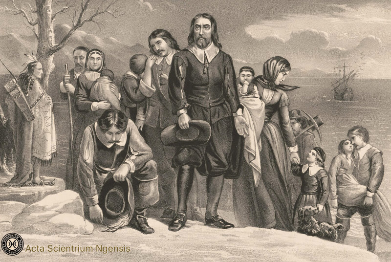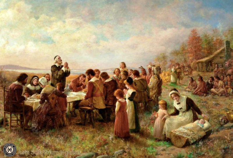 "The First Thanksgiving at Plymouth", by Jennie A. Brownscombe 普利茅斯的第一個感恩節,作者:珍妮•A•布朗斯康姆。圖片來源: 延陵科學綜合室檔案室