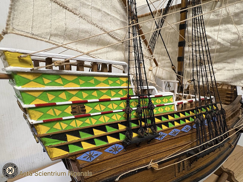 (約7.6米) ,載重約180噸。船上配有主桅、前桅和後桅,後桅採用晚廓帆 (Lateen