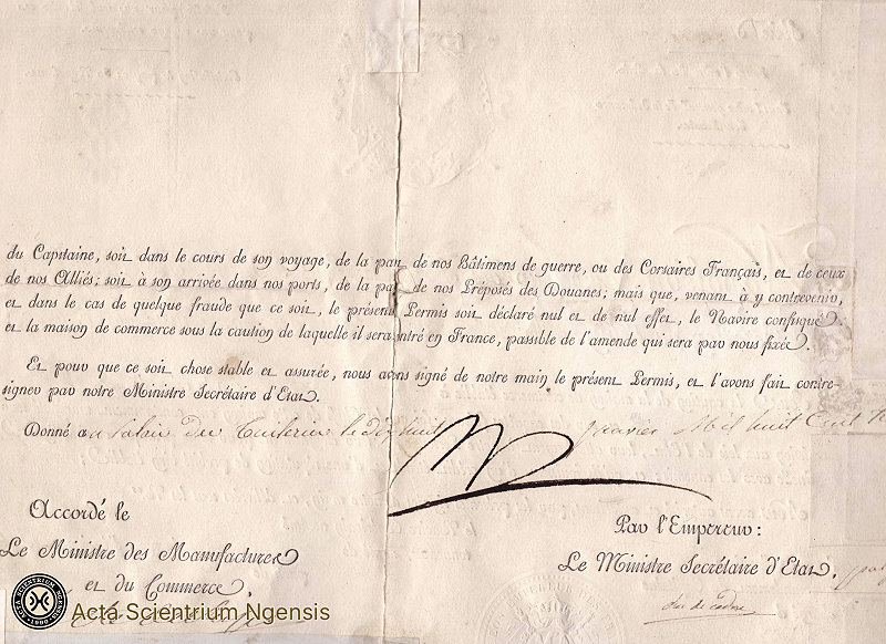 1813年拿破崙手簽美國商船來往波爾多港進行商貿的許可狀,工業和商業部長、國務部秘書長副署令狀。 圖片來源: 延陵科學綜合室藏