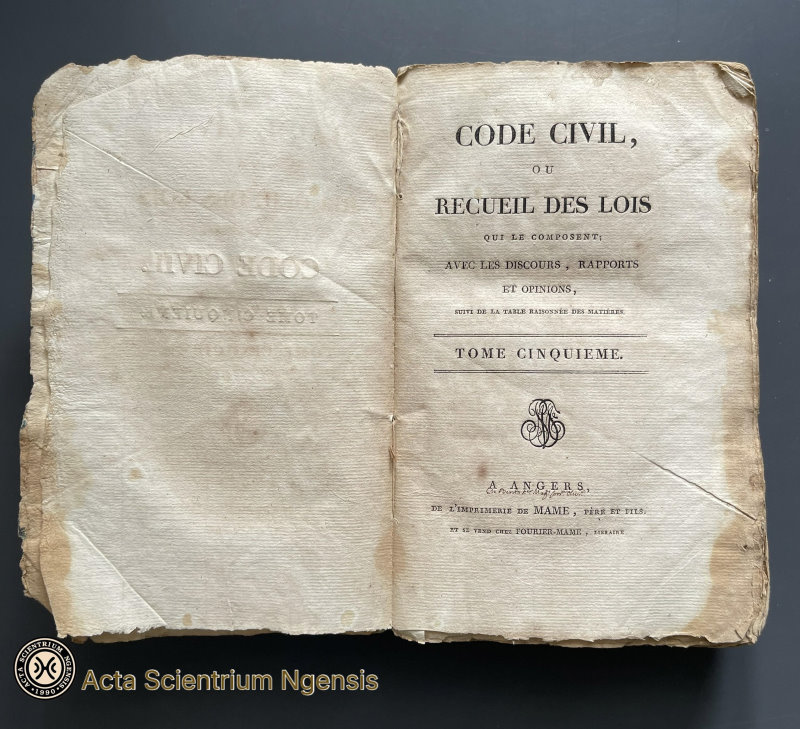 LOIS」,「民法典,法律彙編」。這本書收錄了構成民法的法律條文,還包括演講、報告和意見,以及經過分類的主題目錄。「CODE CIVIL, OU RECUEIL