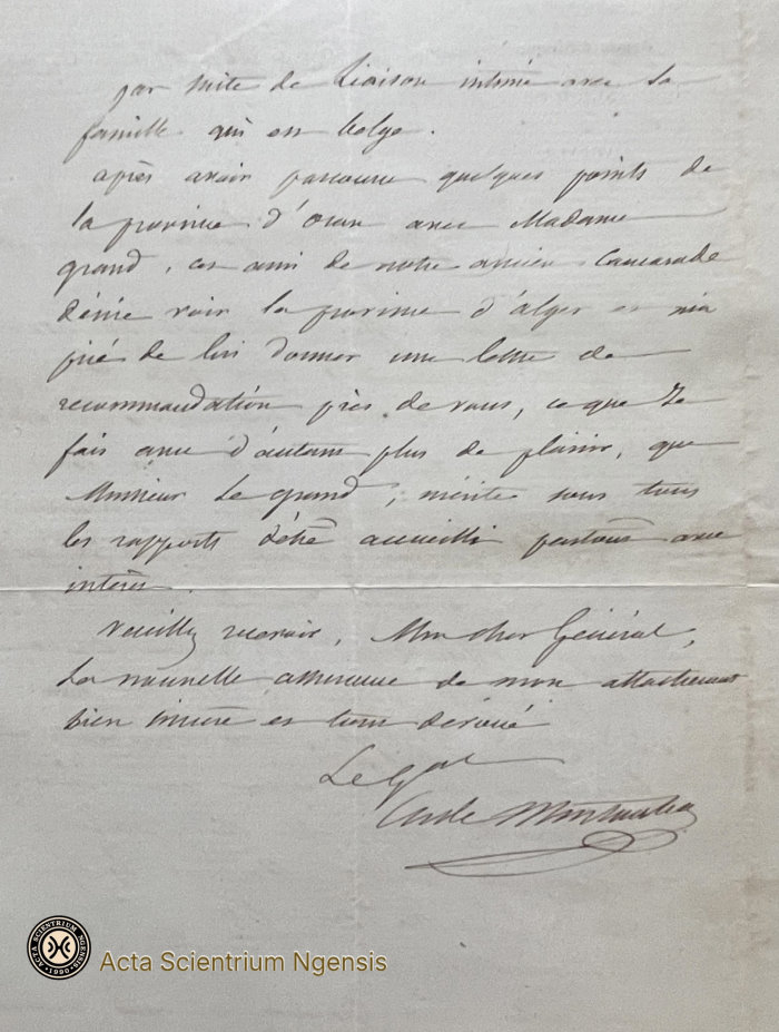 您於24日親信推薦的三位外國軍官,我抵達奧蘭後,將依照您的願望協助他們完成在奧蘭省的旅程;但他們向我提出一個請求,我正式向您報告,他們希望在7日乘坐丹吉爾的船隻下船,前往西班牙,您知道他們不會在我這裡逗留太久。請允許我,親愛的將軍,推薦Le